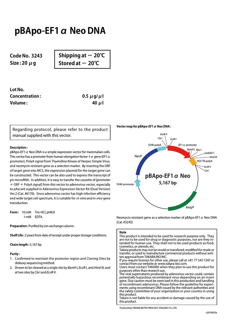 However the first time you use Xfect we recommend testing 25 μg 5 μg and 75 μg. PBApo-CMV Neo DNA is a simple expression vector for mammalian cells. 3660 Size20 μg Shipping at 20 Store at 20 Applications.